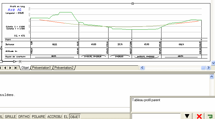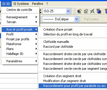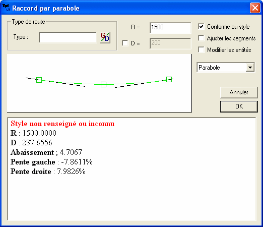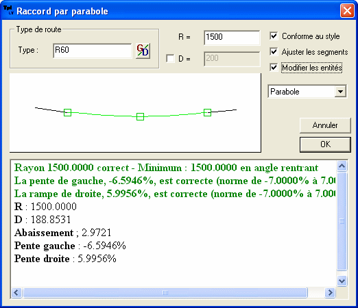 profil projet>Raccordement pour profil par parabole ou arc. La