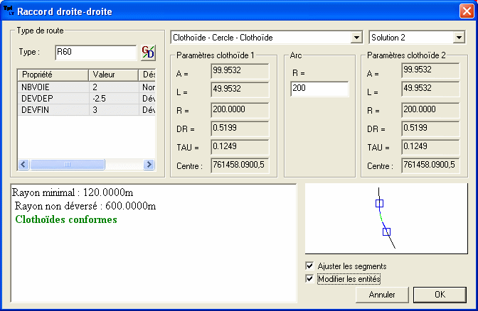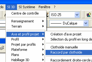 Menu SI 3D>Axe et profil projet>Raccord par clothoïde.