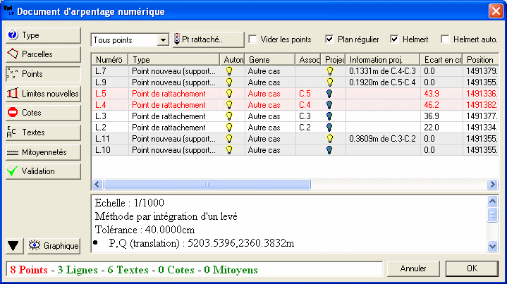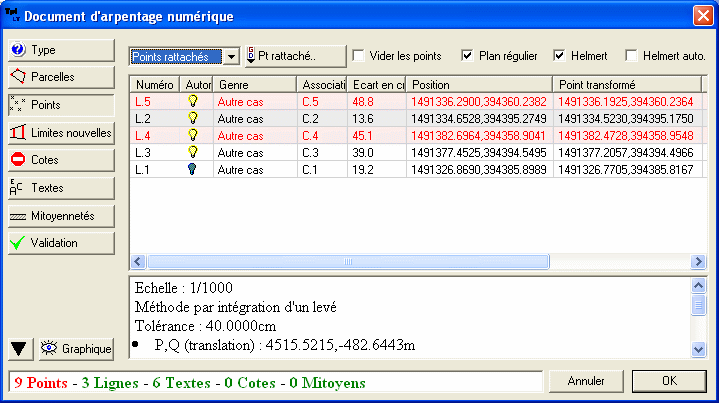 • On va activer l'adaptation d'Helmert dans l'onglet « Points ». Par défaut, on se trouve en mode automatique : Helmert n'est actif que s'il existe un écart signicatif dans les rattachements. Décochez « Helmert auto » et cochez « Helmert ». Le détail est affiché dans la zone d'information.