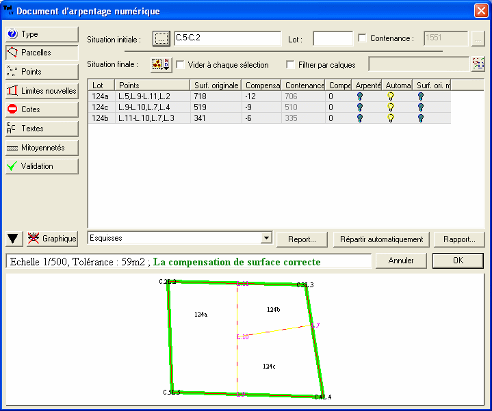• Maintenant pressez en clic gauche à droite de « Situation finale » et sélectionnez les trois nouvelles parcelles avec leur numéro de lot (l'ordre de sélection n'a pas d'importance).
