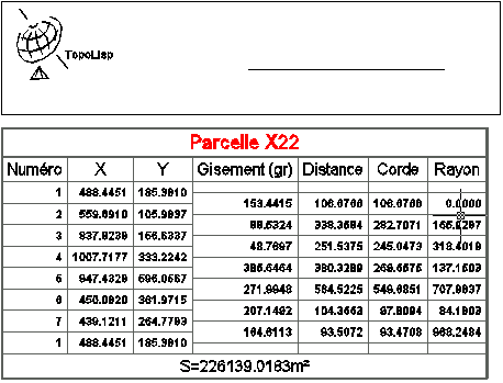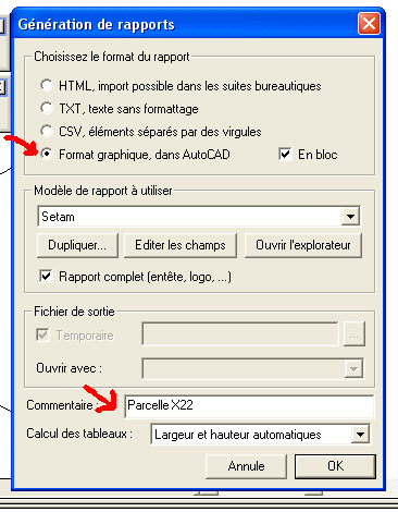 • Il suffit d'indiquer quel type de rapport on souhaite. Ici on choisit un rapport dans AutoCAD LT. On précise également le nom de la parcelle : X22